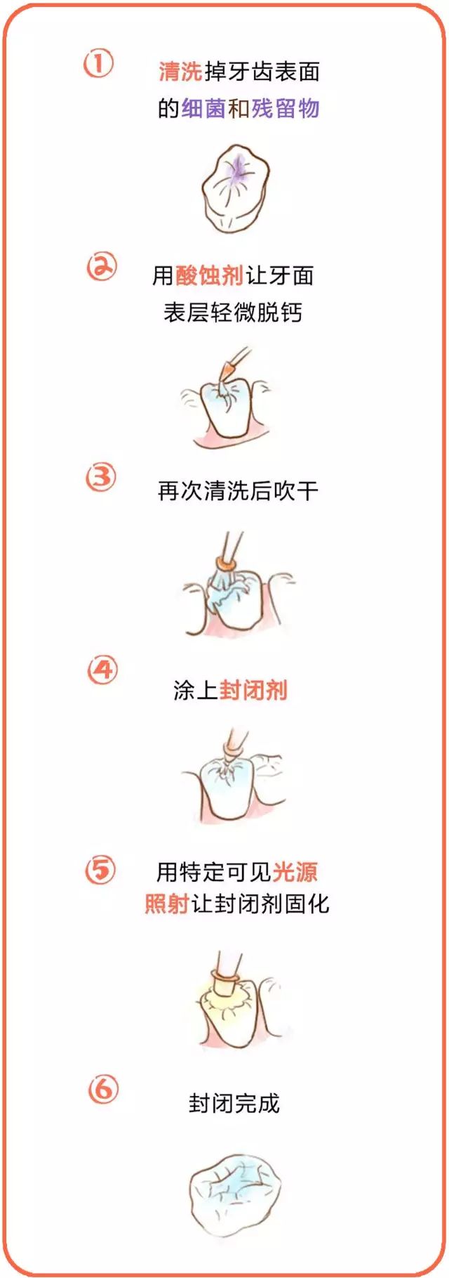 做盖窝沟填充很简单,耗时短,能一次做完。其基本流程係:清洁、酸蚀、冲洗吹乾、搽封闭剂、固化。
