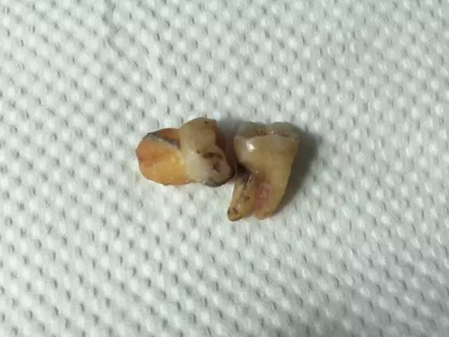 來睇下面張圖,由X照片上睇,两隻智齿对颌萌出,位置睇嚟都好正啦。不過,拔咗之後就係咁啦: